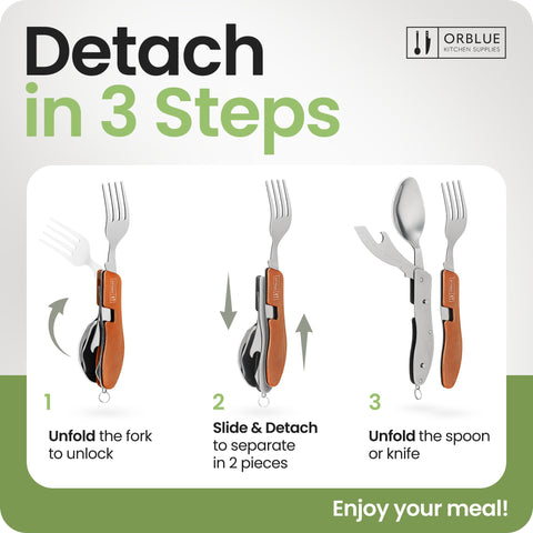 • 4-In-1 CAMPING CUTLERY. Set includes camping spoon , fork, knife and bottle opener. Travel utensil stays together when not in use. And the removable camping fork can be held in one hand, with spoon knife in the other. Convenient lunchbox utensils that you can bring to work or school.