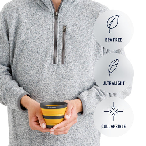 Sea to Summit Frontier UL Collapsible Cup is a versatile and essential piece of gear for outdoor enthusiasts, featuring a durable yet lightweight silicone construction that allows it to collapse flat for effortless storage and transport; its sturdy, non-slip base ensures stability on various surfaces, while the flexible walls make it easy to drink from and pour liquids; ideal for camping, backpacking and travel, this collapsible cup provides a practical solution for consuming beverages on the go; made from BPA-free material, it ensures safe use with food and hot liquids and the integrated volume markings assist with accurate measurements; the compact design saves valuable space in your pack, making it an indispensable item for minimalistic adventurers seeking reliable, high-performance gear for their outdoor excursions. Comes in Aqua Sea, One Size.