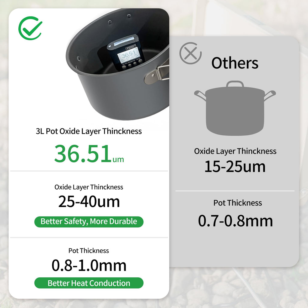 - [Lightweight & Durability] This Camping pots and pans are typically made from lightweight aluminum materials to facilitate easy transport and reduce the overall weight of camping gear. They are designed to withstand outdoor conditions, including heat-insulating handle, pour water handle, delicate spout, drain hole, etc.