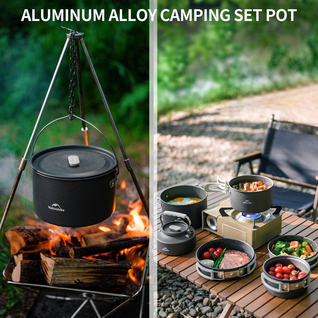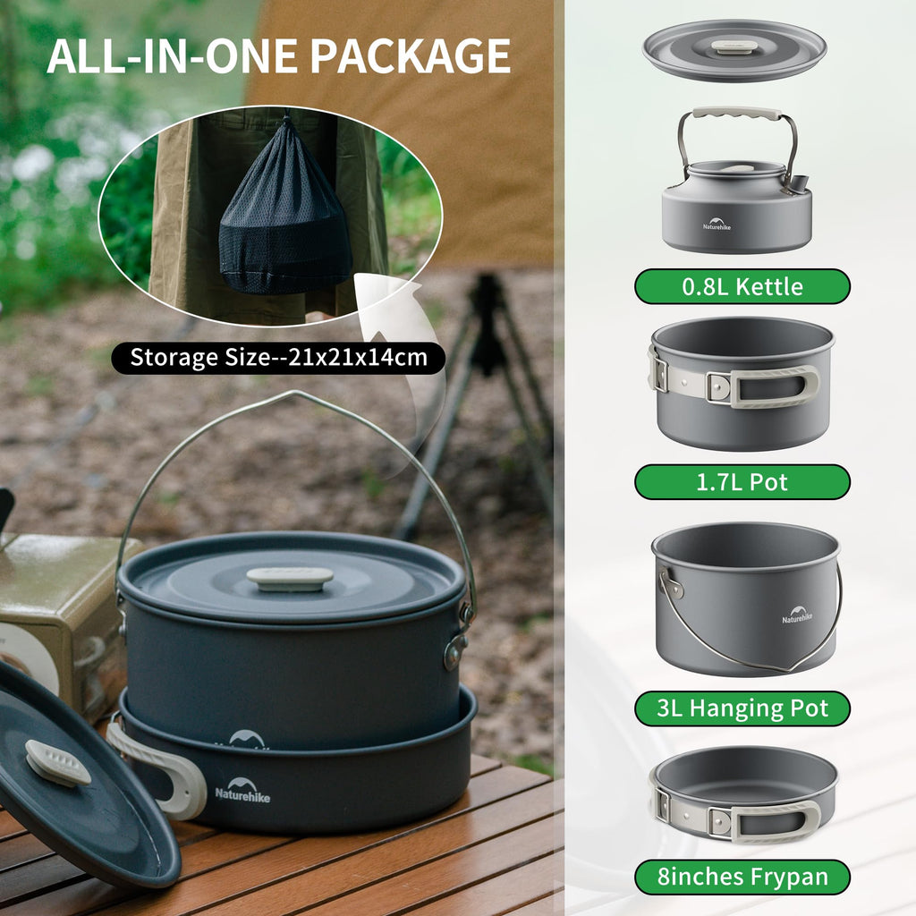 - [Product Information] Naturehike Camping Pots and Pans are essential cooking utensils designed for outdoor use, catering to the needs of campers, backpackers, and outdoor enthusiasts. Here’s a detailed description: 0.8L kettle+1.7L pot+3L hanging pot+8inches frypan. Storage size: 21x21x14cm. Weight: 1.1kg.